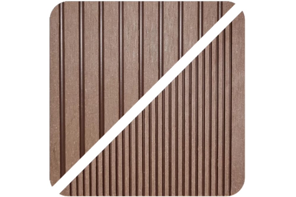 Bordázott WPC kerítés deszka csokibarna színben, 2900x145x22mm.  A Bordázott WPC kerítés deszka mind a két felével rakható, az egyik sűrűn, a másik ritkán bordázott.  A Bordázott WPC kerítés választásával esztétikus és időtálló kerítés készíthető.